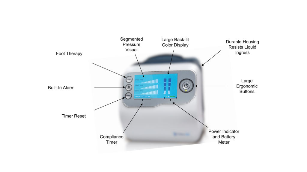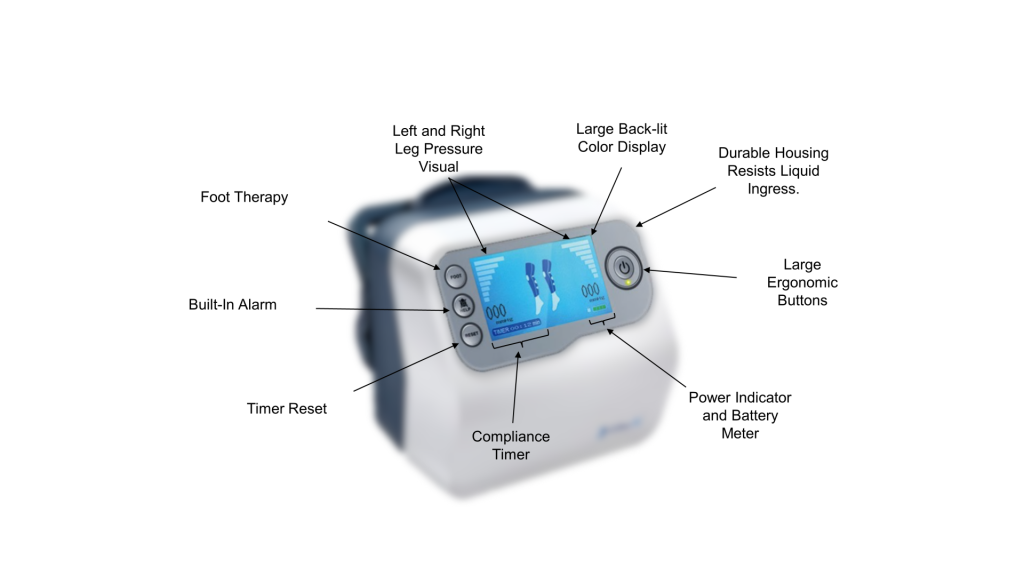 • Display features left and right leg pressures, compliance timer, power indicator, alarm indicators.